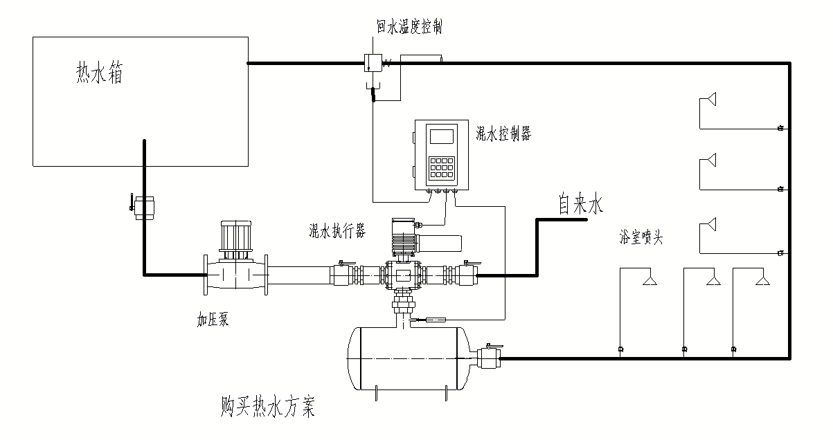 2.采用預(yù)混水方式:這種方法是提前把水混合到40°C左右,需用時(shí)通過(guò)管道供給,這種方式適用于購(gòu)買的熱水、小型智能鍋爐或空氣能熱泵,配置一個(gè)容量足夠大的熱水箱,然而混水需要增添一部分設(shè)備,如預(yù)混水箱、三通合流閥、水泵、控制箱等,增加了設(shè)備占用空間。
