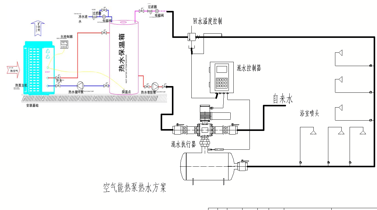 1.采用智能鍋爐或大馬力空氣能熱泵,直接把水溫加熱到40°C左右,直接供水使用,由于集體洗浴用的水量變化性較大,配置的熱源要足夠大,這種方法會(huì)增加投資成本。